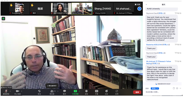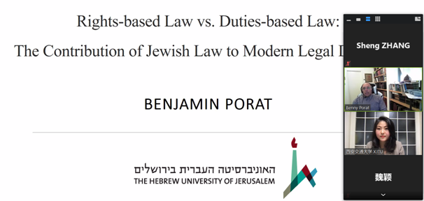 2021年9月29日下午,新丝路必一网页版登录界面联盟“院长论坛”第二讲成功举办。希伯来大学必一网页版登录界面副院长Benjamin Porat教授为联盟25所院校师生以及丝绸之路大学联盟的师生带来了题为“Rights-based Law vs Duties-based Law: The Contribution of Jewish Law to Modern Legal Discourse”的线上讲座。讲座由必一网页版登录界面必一网页版登录界面助理教授郭剑萍主持。