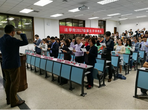 最后,全体新生在丁卫副院长的带领下庄重誓言:“公平所系,正义相托。在这庄严时刻,我郑重宣誓:我自愿投身法治事业,忠实履行一个法律人应尽的全部义务,恪守宪法,热爱祖国,忠于人民,弘扬法治精神,维护正当权益,勤勉诚信,清正廉洁。我决心竭尽全力,捍卫法律职业的圣洁与荣誉,养天地正气,行人间正道,求正义,尚卓越,为法治中国的繁荣发展和人类正义的美好未来奋斗终身!”典礼在铿锵的誓词声中圆满结束。