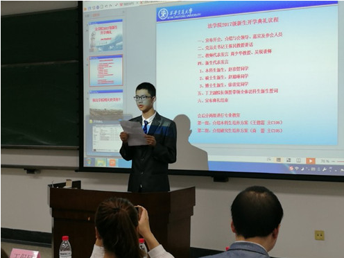在新生代表的发言环节,本科新生赵崇智同学回顾高中及入校的军训生活,对即将开始的大学生活展开憧憬。立志紧跟时代步伐,践行唐文治先生“须知吾人欲成学问,当为第一等学问;欲成事业,当成第一等事业;欲成人才,当为第一等人才;而欲成第一等学问、事业、人才,必先砥砺第一等品行”的要求,做青年之楷模。硕士新生赵婧琳同学首先向老师们表达了教师节的祝福,接着她结合自己的成长经历,强调我们要牢记“精勤求学、敦笃励志、果敢力行、忠恕任事”的校训,时刻不忘向老师学习,踏实做事,胸怀坦荡,立志做时代的英才;潜修法律,解民生之艰。硕士毕业于英国格拉斯哥大学的博士新生徐济宽结合自己在国外求学的见闻,给学弟学妹们介绍了法律人的三个职业发展道路—律师、法官、研究人员,以及自己实习经历与感触。