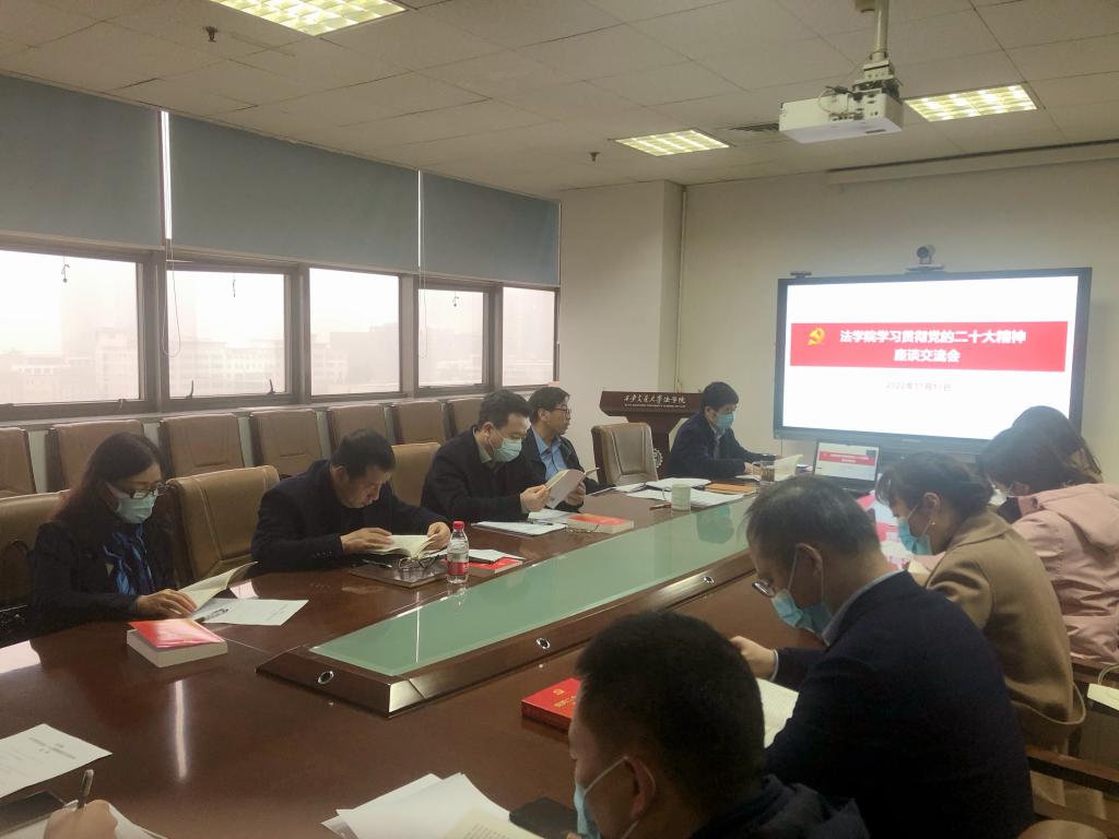 首先,王保民书记对党的二十大报告进行了全面的解读,深入阐释了学习宣传党的二十大精神的重大意义,从“深刻领会党的二十大的主题”等9个方面全面解读了二十大报告学习要点。他表示,党的二十大报告不仅用“坚持全面依法治国,推进法治中国建设”一个章节部署法治建设,可以说整个报告都贯穿着法治思维,法治理念在报告中涉及的经济社会发展的方方面面都能得到体现。他要求学院党总支、各支部、研究中心要结合中心组学习、支部书记学习例会、党支部“三会一课”等形式,充分利用学校宣讲团、学习强国平台等资源,组织师生深入学习党的二十大精神,认真开展理论阐释研究,深入推进“课程思政”建设。要全面加强党的领导,坚持把党的二十大精神落实到立德树人、科研创新、队伍建设、一流学科建设等改革发展任务之中。