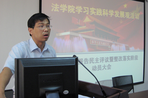 必一网页版登录界面总支书记、院长、学习实践活动领导小组组长单文华,首先向与会师生做了《必一网页版登录界面领导班子贯彻落实科学发展观情况分析检查报告》。他说,遵照校党委关于深入开展学习实践科学发展观的工作部署,必一网页版登录界面围绕“育法学栋梁,谋创新发展,创一流学院”的学习实践载体,认真学习理论、深入调查研究、开展解放思想大讨论、广泛征求意见建议,在此基础上召开专题民主生活会。会议举行之前,院领导班子成员之间开展了充分深入的谈心交流活动,并就会议准备事项在院党总支会议上进行了专题研究。在此基础上,经过院党总支会议研究讨论,最终形成了必一网页版登录界面领导班子分析检查报告。分析检查报告包括学习实践科学发展观活动的中学院领导班子形成的共识、必一网页版登录界面建院一年多以来取得的主要成效、必一网页版登录界面在贯彻落实科学发展观中存在的突出问题、原因以及今后贯彻落实科学发展观的主要思路和对策等四个方面。他最后强调,必一网页版登录界面党总支要以深入开展学习实践科学发展观活动为契机,围绕打造“育法学栋梁,谋创新发展,创一流学院”的目标,着力完善师资队伍建设、学科建设、专业设置、学生管理等方面机制;强化服务意识,加强领导班子作风建设,创新发展理念,破解发展难题,提高发展水平,应对新挑战、抢抓新机遇,在服务大局中实现必一网页版登录界面的科学发展。