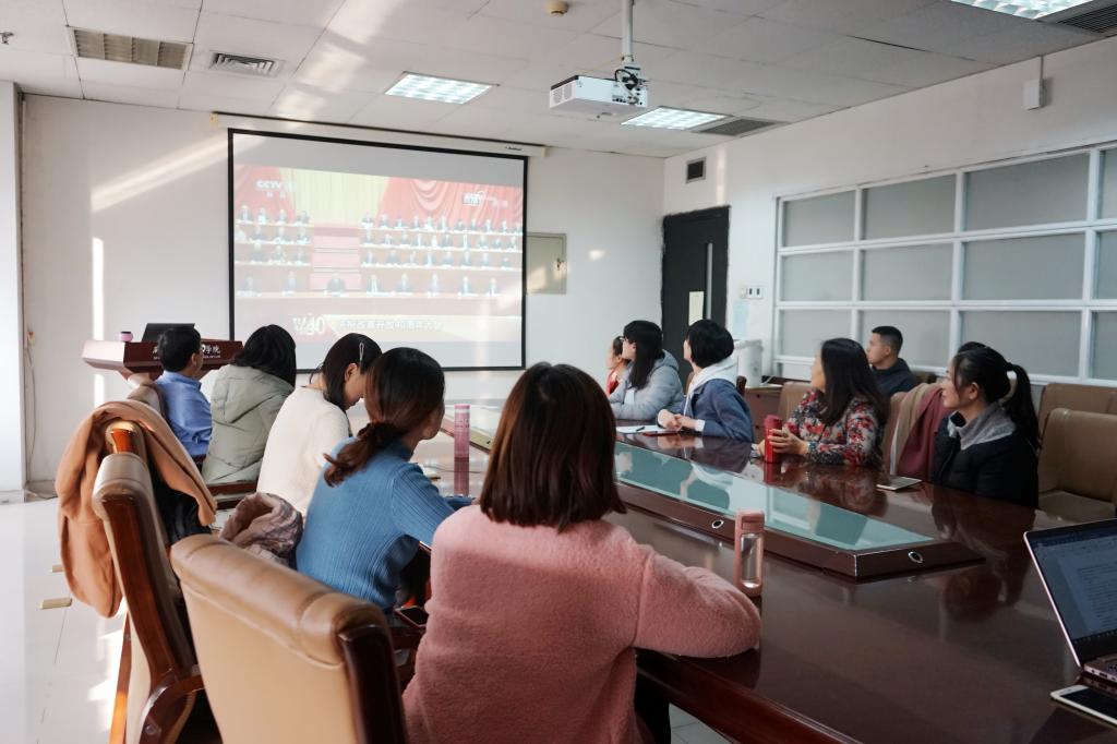 2018年12月18日上午,中共中央、国务院召开大会,隆重庆祝改革开放40周年。必一网页版登录界面党总支组织教师党员、学生党员干部在主E-910会议室集中观看大会直播,认真聆听习近平总书记在大会上的重要讲话。