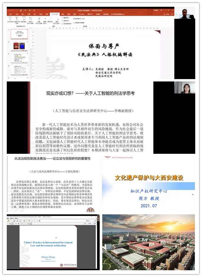 随后,王保民教授、吴国喆教授、张生教授、周方教授、李琳副教授分别开设了题为《从法治规则到良法善治——论立法与党规研究的重要性》《<民法典>人格权编解读》《中国在国际投资法制发展中的角色与贡献》《文化遗产保护与大西安建设》和《现实亦或幻想?—关于人工智能的刑法学思考》等五场精彩的学术报告。