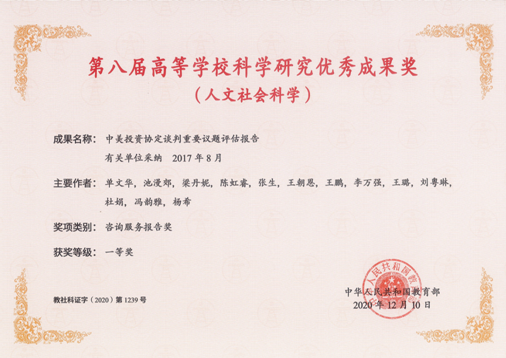 团队受中美投资协定双边谈判中方主谈部门商务部委托,撰写《中美投资协定谈判重要议题评估报告》等系列报告,受到专函表扬,并于2020年获教育部高等学校科学研究优秀成果一等奖