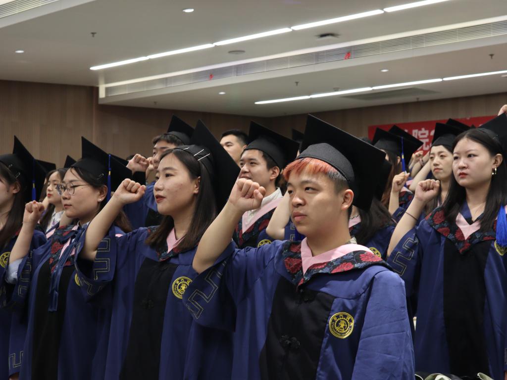 作为法律学子,在即将奔赴祖国各地建功立业之际,全体毕业生在张乃钟老师的带领下庄严宣誓《必一网页版登录界面法科生誓词》。