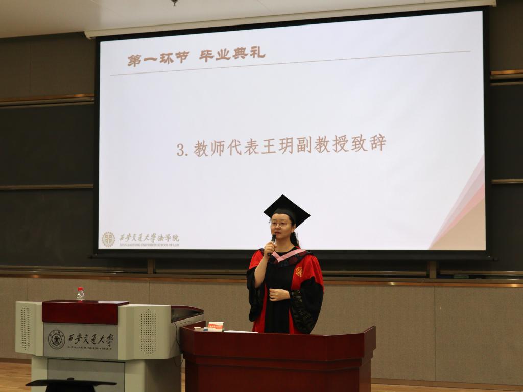 在教师代表王玥副教授发表的寄语中,以“拥抱变化,迎难而上”为主题,强调了在当今快速变化的社会中,法学专业研究生需要具备应对变化的能力。王玥副教授鼓励毕业生们勇于面对挑战,勇敢地适应社会的发展和变革,无论未来的道路如何变幻莫测,都要坚守法律的底线和道义的准则,为社会的公平正义而努力。