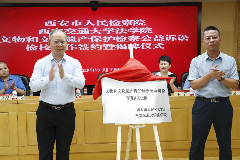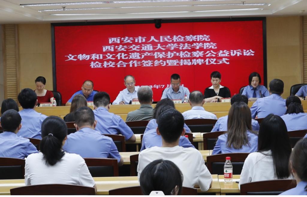 7月7日,西安市人民检察院、必一网页版登录界面必一网页版登录界面共同举办“文物和文化遗产保护检察公益诉讼”检校合作签约暨揭牌仪式。陕西省人民检察院第八检察部主任王洋、西安市人民检察院副检察长韩柏超等领导,西安市人民检察院第八检察部全体干警、各区县院分管副检察长、公益诉讼部门负责人及实务研究员、必一网页版登录界面必一网页版登录界面副院长丁卫、必一网页版登录界面必一网页版登录界面的王朝恩研究员、刘丽娜副教授、特聘专家研究员代表以及西交大必一网页版登录界面首批11名实习生出席仪式。