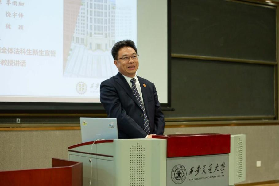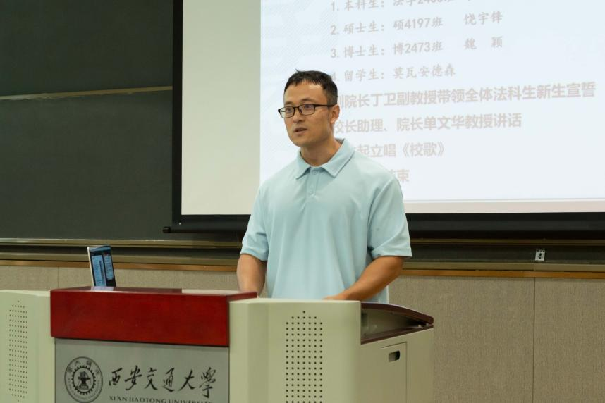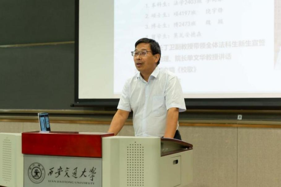 丁卫副院长带领全体法科生新生庄严宣誓:“公平所系,正义相托。在这庄严时刻,我郑重宣誓:我志愿投身法治事业,忠实履行一个法律人应尽的全部义务,恪守宪法,热爱祖国,忠于人民,弘扬法治精神,维护正当权益,勤勉诚信,清正廉洁。我决心竭尽全力,捍卫法律职业的圣洁与荣誉,养天地正气,行人间正道,求正义,尚卓越,为法治中国的繁荣发展和人类正义的美好未来奋斗终生!”