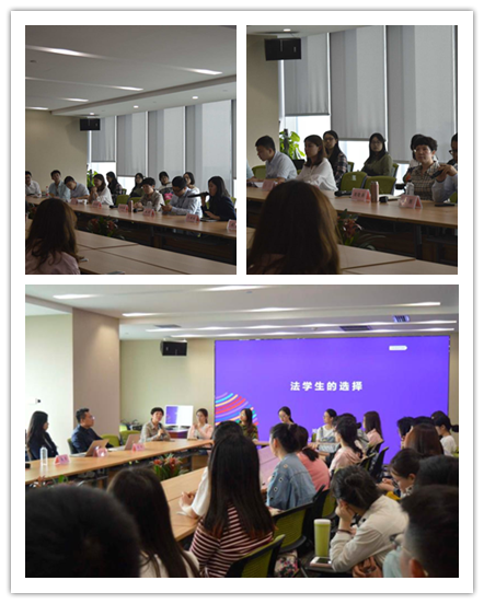 接下来,张嘉悦律师为我们分别介绍了包括武豪、张祎、张晓哲等在内的其他几位在场的青年律师。其中,武豪律师契合本期交流会指导就业的主题,站在自己的角度,向同学们全面比较了公安、检察院、法院、法学科研人员及律师五种法学生就业选择的优缺点,为同学们将来的就业选择提供了良好的参考依据;张祎律师作为一名曾经的“学霸”法学生,她向我们解释了工作态度、执业心态和培养自己的一份特长、喜好的重要性,让同学们更加清楚了律师执业所需要的除专业知识以外的其他重要的能力;张晓哲律师作为一名有着较严重律师执业强迫症的青年律师代表,则向我们陈述了他认为的在校法学生应为将来律师执业培养的几种认识和能力:一是,要意识到自己所毕业的学校只是走向社会的第一步,选择什么样的职业才是决定自己以后包括薪资、社会地位以及人生价值实现与否的关键;二是,要加强自我知识和能力的完善,比如,通过阅读中国裁判文书网上的相关文书来提高自己的文字表达能力等;三是,要相信“颜值即正义”,要努力培养自己良好的职业形象;四是,要积极争取更多数量和种类的实习机会,从实习经验和感受中做出更加适合自己的职业选择。最后,张嘉悦律师总结到:人生最重要的是一个过程,可能你的目标不需要太远大,但是每一个小目标的完成都是自己人生的一种经历和成长。整个交流会过程中,在场的各位律师相互补充、一一地对同学们随时提出的包括律师职业、就业选择等各种问题做了详尽细致的解答。