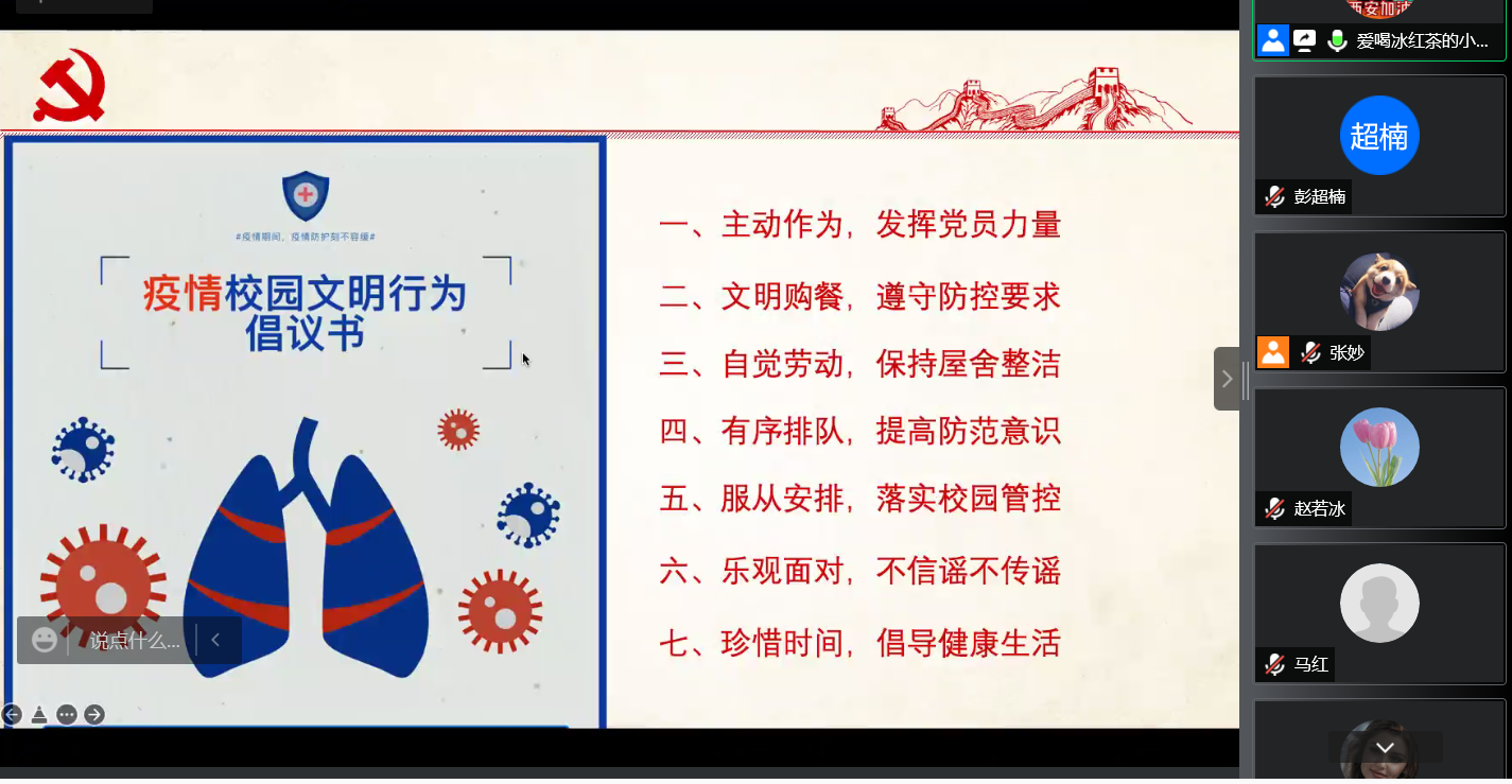 随后,党支部宣传委员彭超楠带领大家一起学习疫情下校园文明行为倡议书,她谈到目前新冠疫情仍在持续,交大校园在师生员工的努力下安静平稳,为了巩固这来之不易的防控成效,我们要主动作为,发挥党员和积极分子的先锋模范作用,积极落实防控举措,带头做好志愿服务,主动关心班级、宿舍同学的思想动态及心理状况,弘扬战疫正能量。